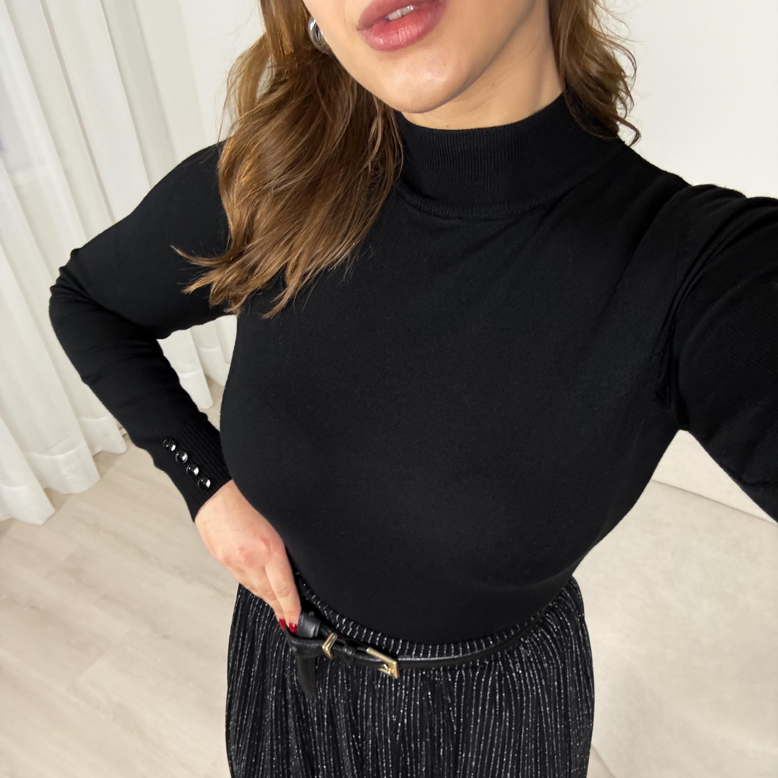 Blusa de manga longa confeccionada em tricô modal, modelagem justa ao corpo, e gola média. Possui comprimento tradicional e detalhe de botões da mesma cor da peça nos punhos.