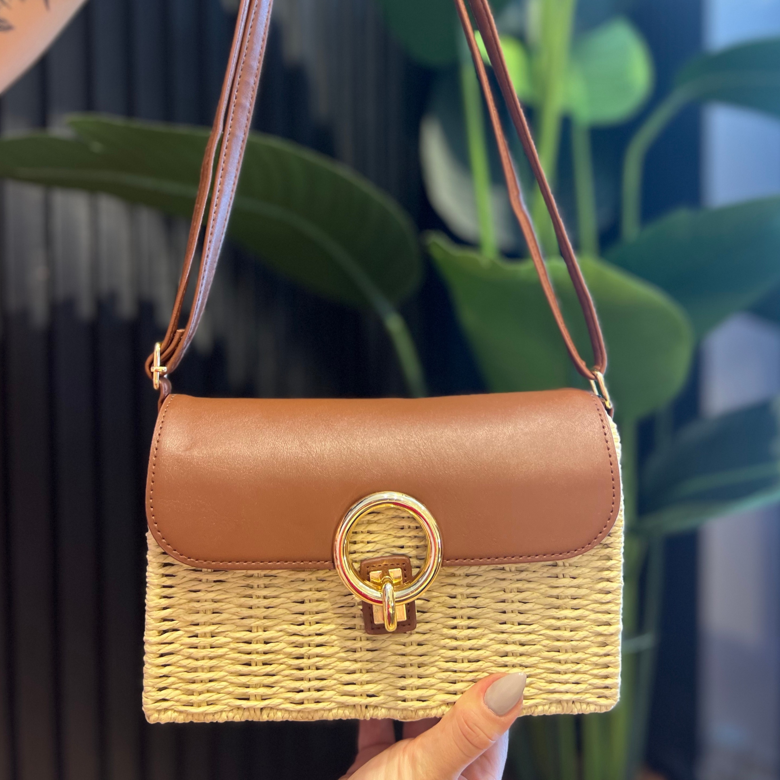 Bolsa de palha com detalhes em P.U na cor marrom. Possui fechamento por tampo e fivela frontal dourada. Alça regulável.
