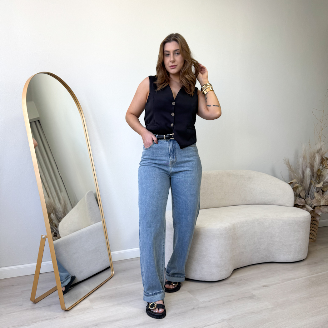 Calça jeans com lavagem média e modelagem reta sem elastano. Possui cintura alta com cós com passante para cinto, bolsos frontais e traseiros funcionais, design clássico e fechamento frontal por zíper e botão.