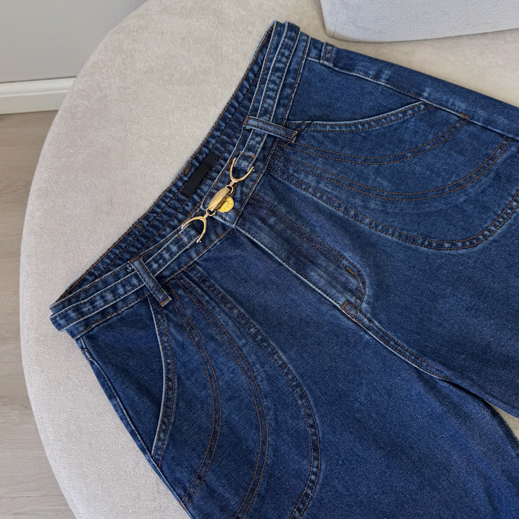 Calça jeans de lavagem escura, sem elastano e modelagem wide leg. Possui cintura alta com detalhe de cinto não removível, bolsos frontais com pesponto na cor caramelo, bolsos traseiros funcionais e barra larga.