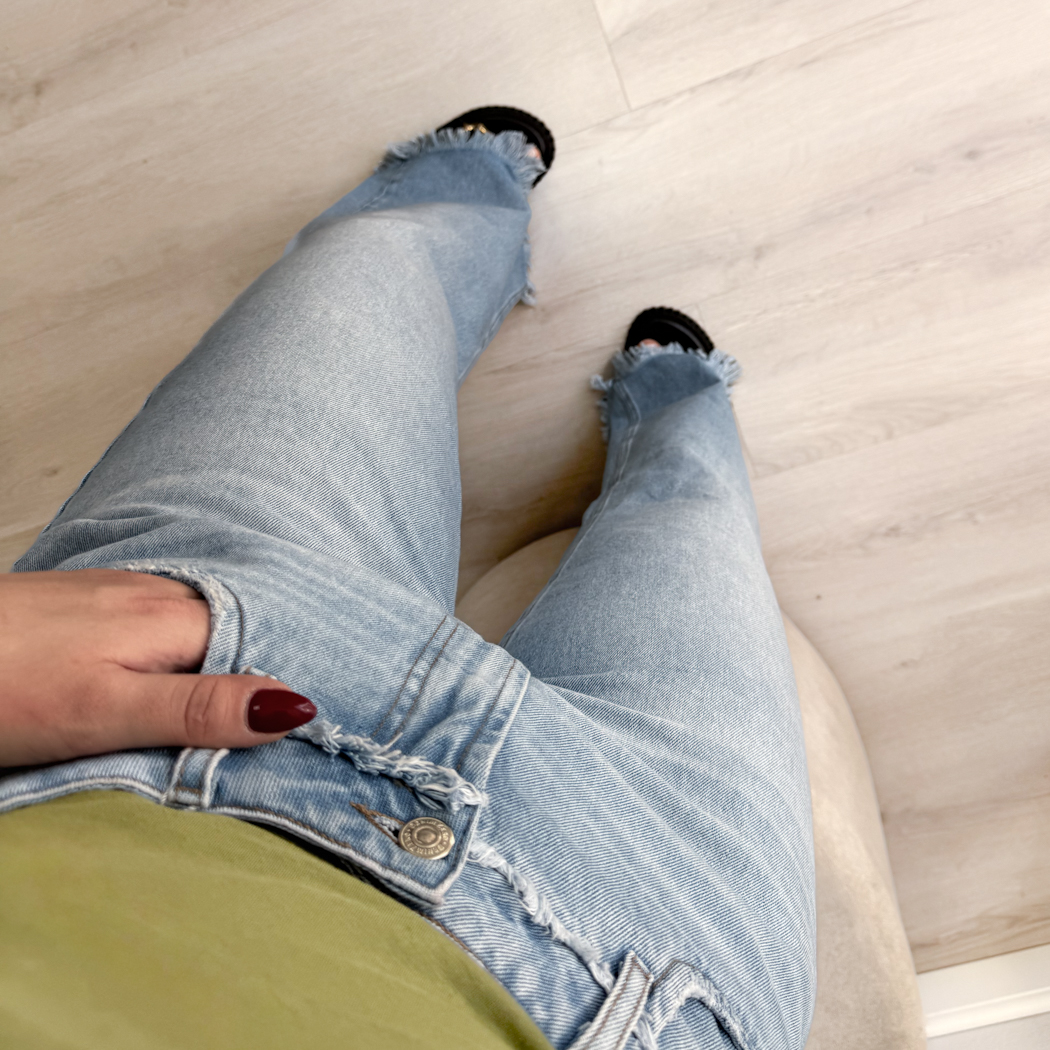 Calça jeans de lavagem clara com efeito marmorizado em seu tecido. Modelagem wide leg, com cintura alta e comprimento entrepernas de 81cm. Bolsos da frente e costas são utilitários e possuem detalhes desfiados, assim como o cós da peça. Barra desfiada e não possui elastano.
