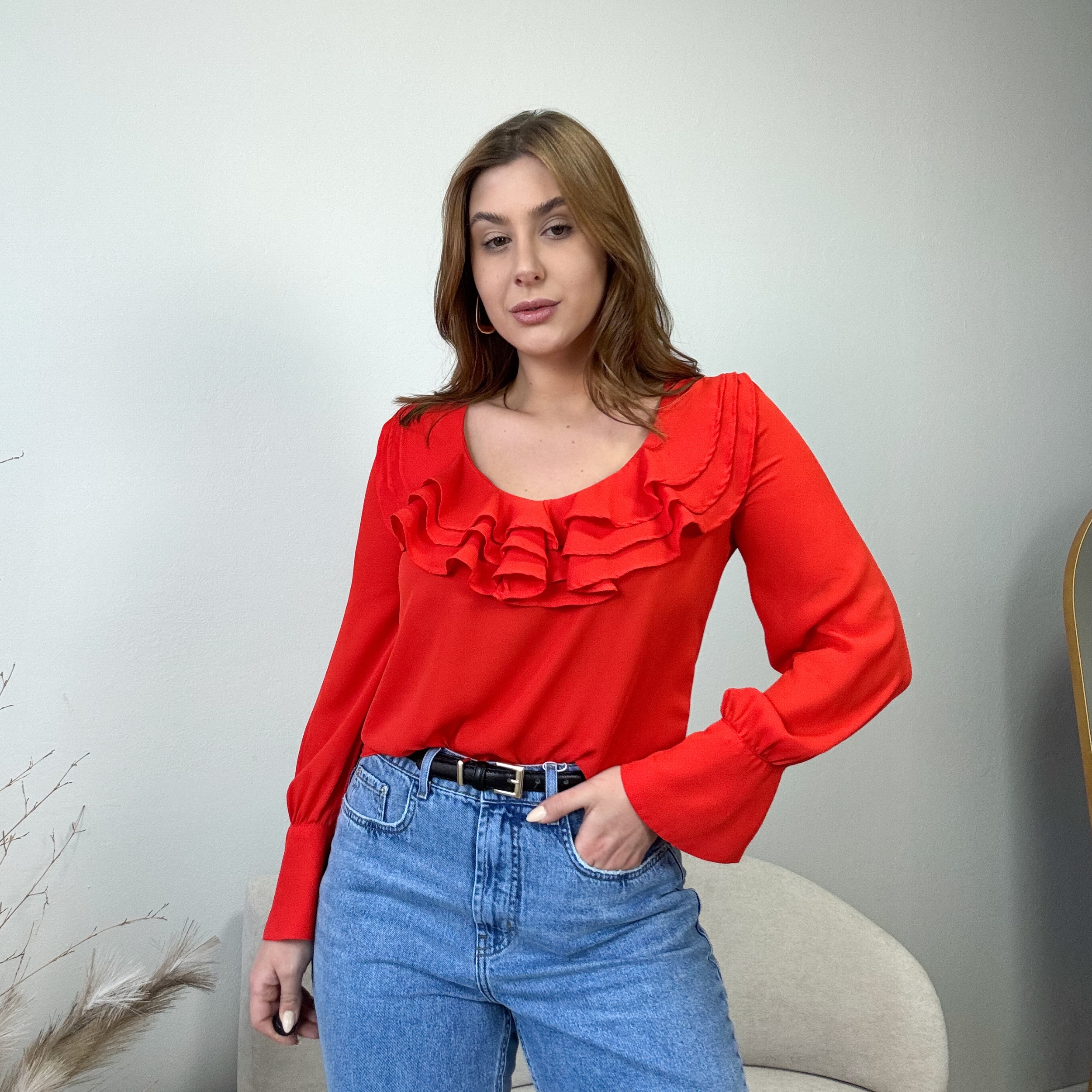 Blusa confeccionada em crepe e modelagem soltinha ao corpo. Possui decote em V com babados em camadas do mesmo tecido da peça, mangas longas com trio de botões dourados nos punhos e comprimento tradicional. Tecido duplo no busto para evitar transparência.