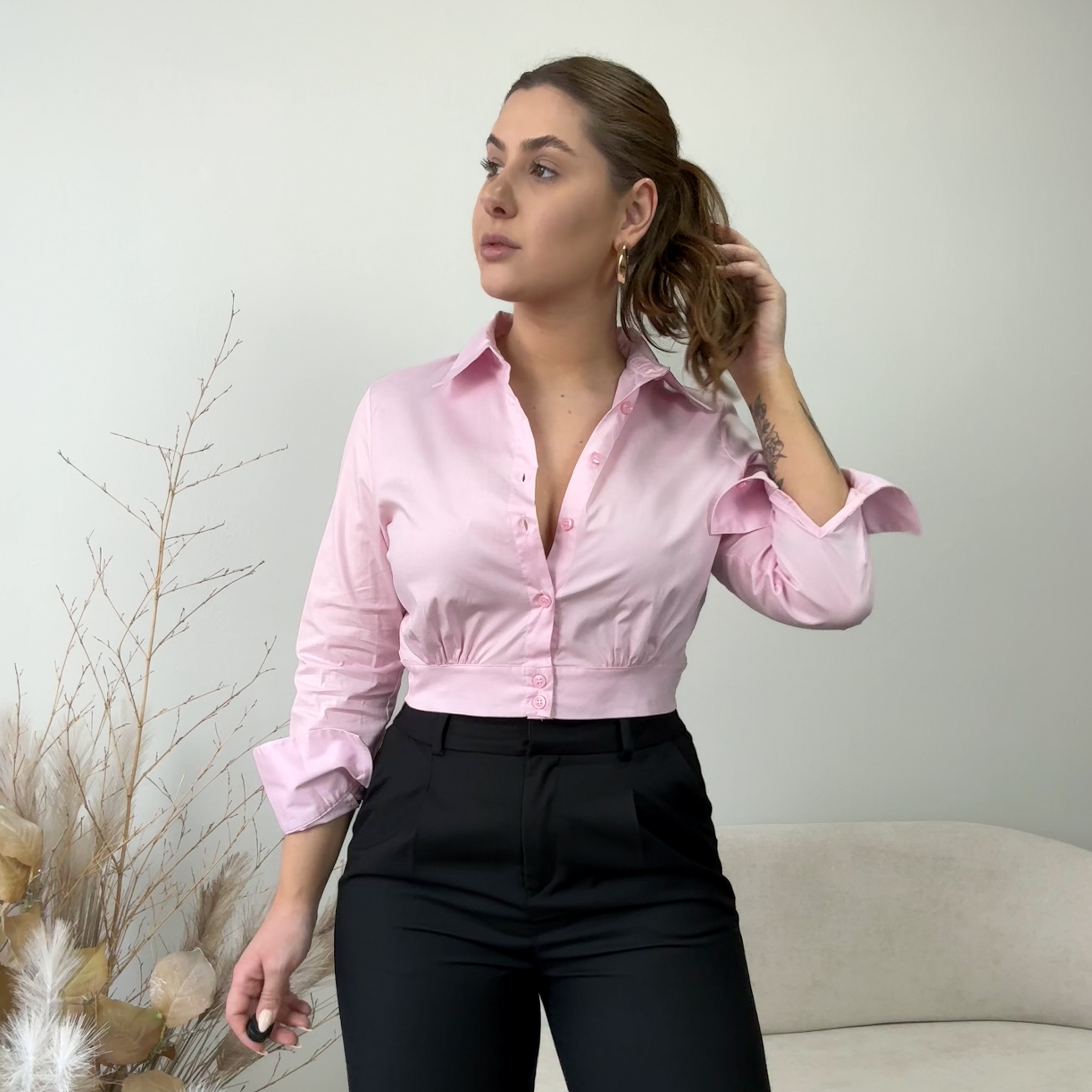 Camisa confeccionada em tricoline, modelagem ajustada e comprimento cropped. Possui parte traseira mais comprida, mangas longas e abotoamento frontal com detalhe de botões duplos.