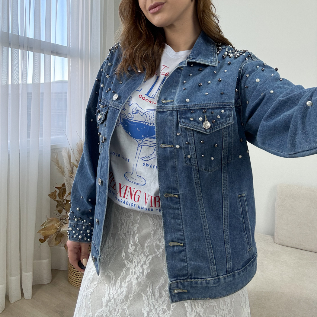 Jaqueta confeccionada em jeans de lavagem média e sem elastano. Possui modelagem oversized, aplicação de pérolas e strass e fechamento frontal por abotoamento, assim como nos punhos.