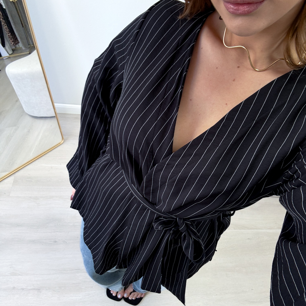 Kimono confeccionado em viscose sarjada e com padronagem risca de giz. Modelagem acinturada e acompanha faixa do mesmo tecido para amarração. As mangas são flare e possui recortes laterais para maior conforto.