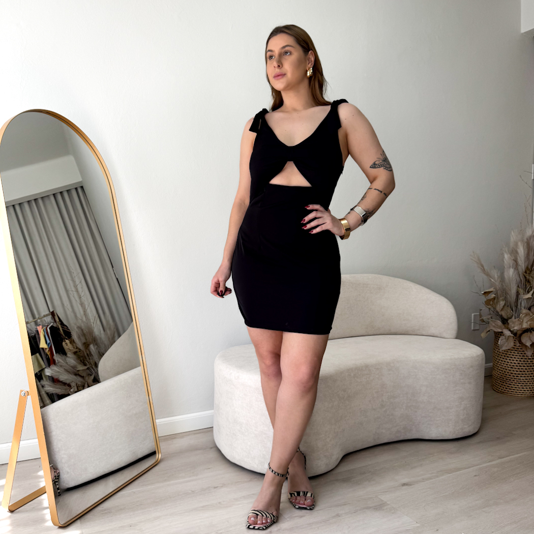 Vestido curto confeccionado em crepe com toque leve e fresquinho. Possui forro, detalhe de nó fixo no busto e bojo interno. Alças largas que são ajustáveis por amarração e fechamento lateral por zíper invisível.