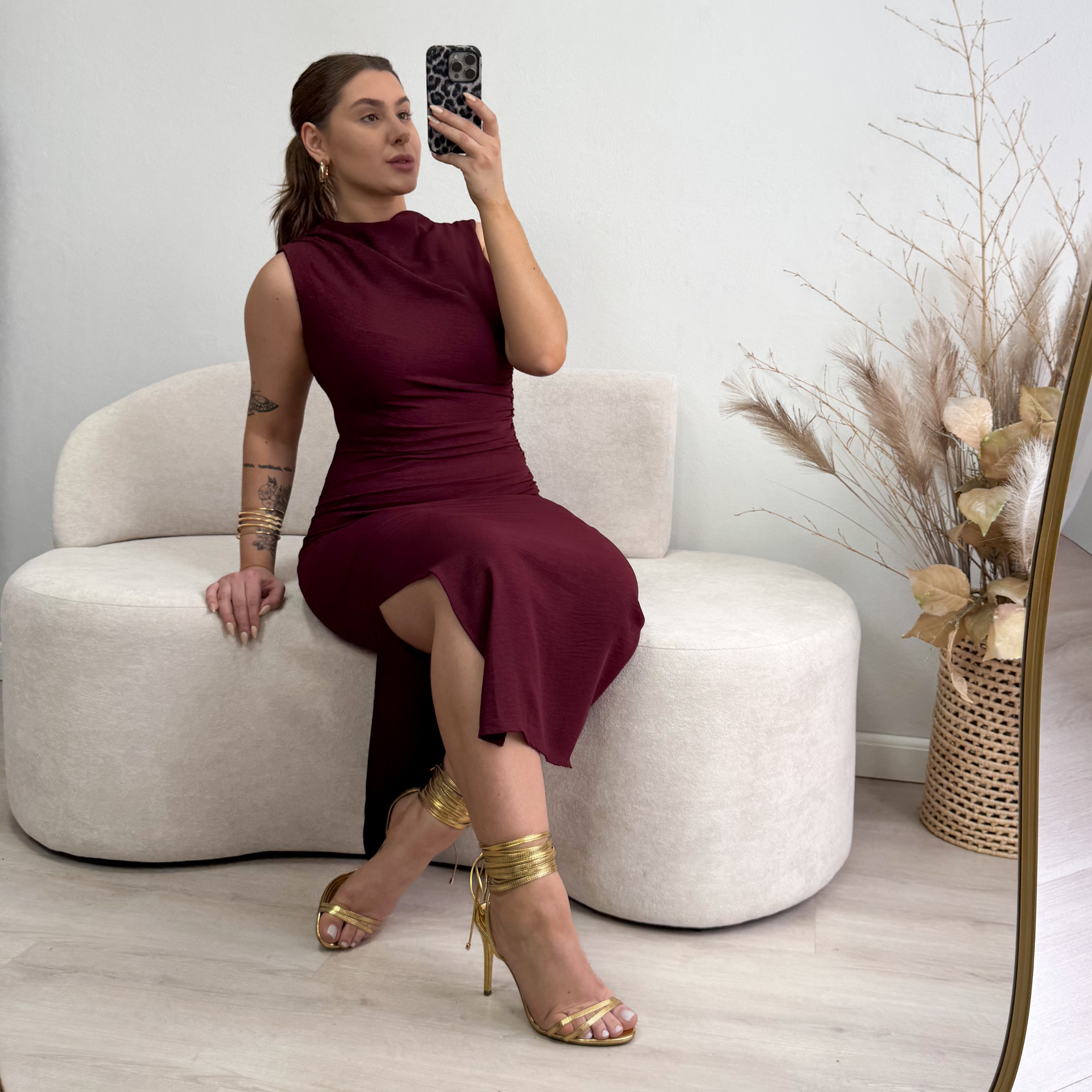 Vestido confeccionado em crepe com elastano, modelagem justa e comprimento midi. Possui busto fechado com gola média, drapeados e fenda lateral, além de forro interno e fechamento por zíper nas costas.