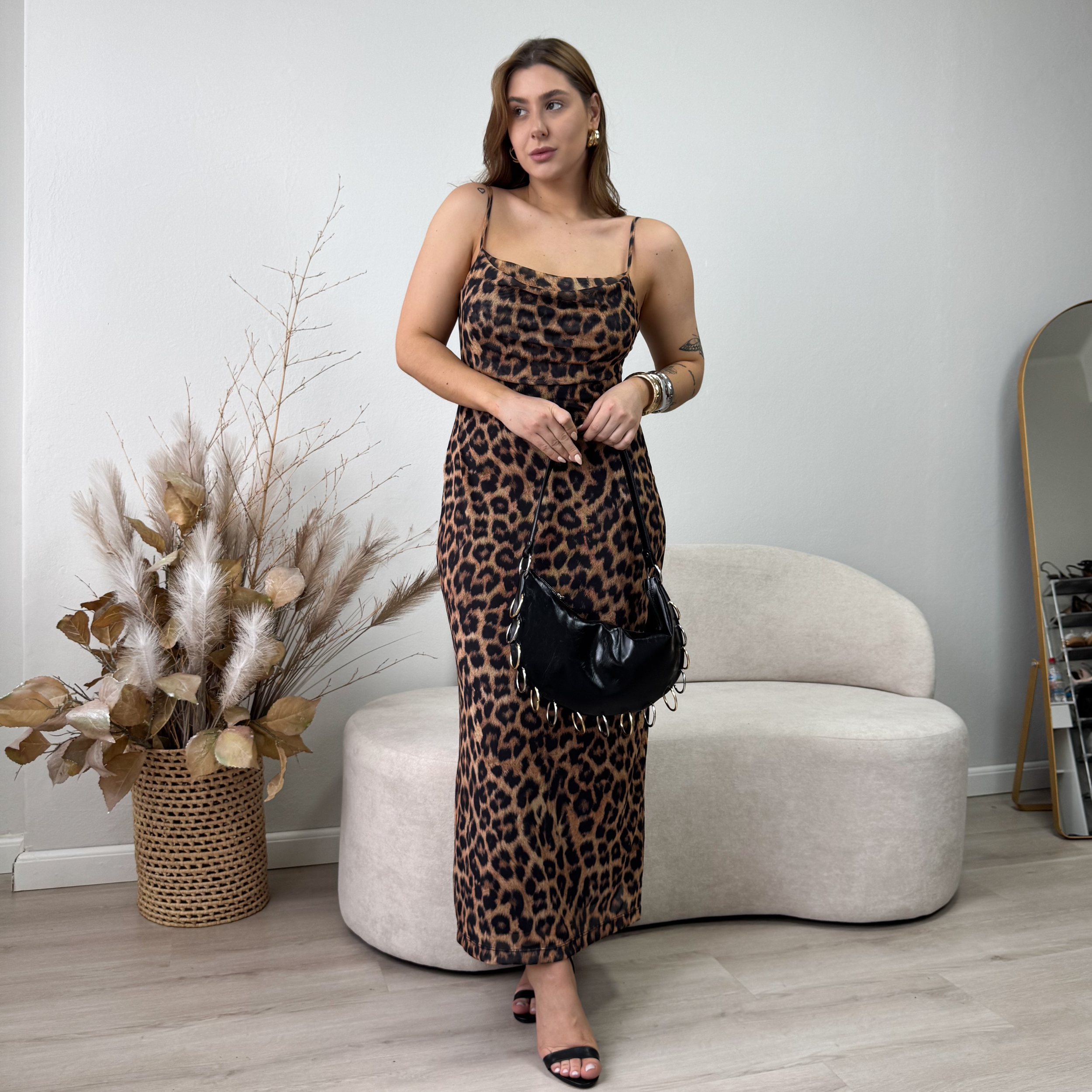 Vestido confeccionado em malha com tule estampado animal print sobreposto. Possui caimento perfeito e leve no corpo, comprimento longuete, alcinhas reguláveis e decote frontal degagê. Fechamento posterior por zíper invisível.