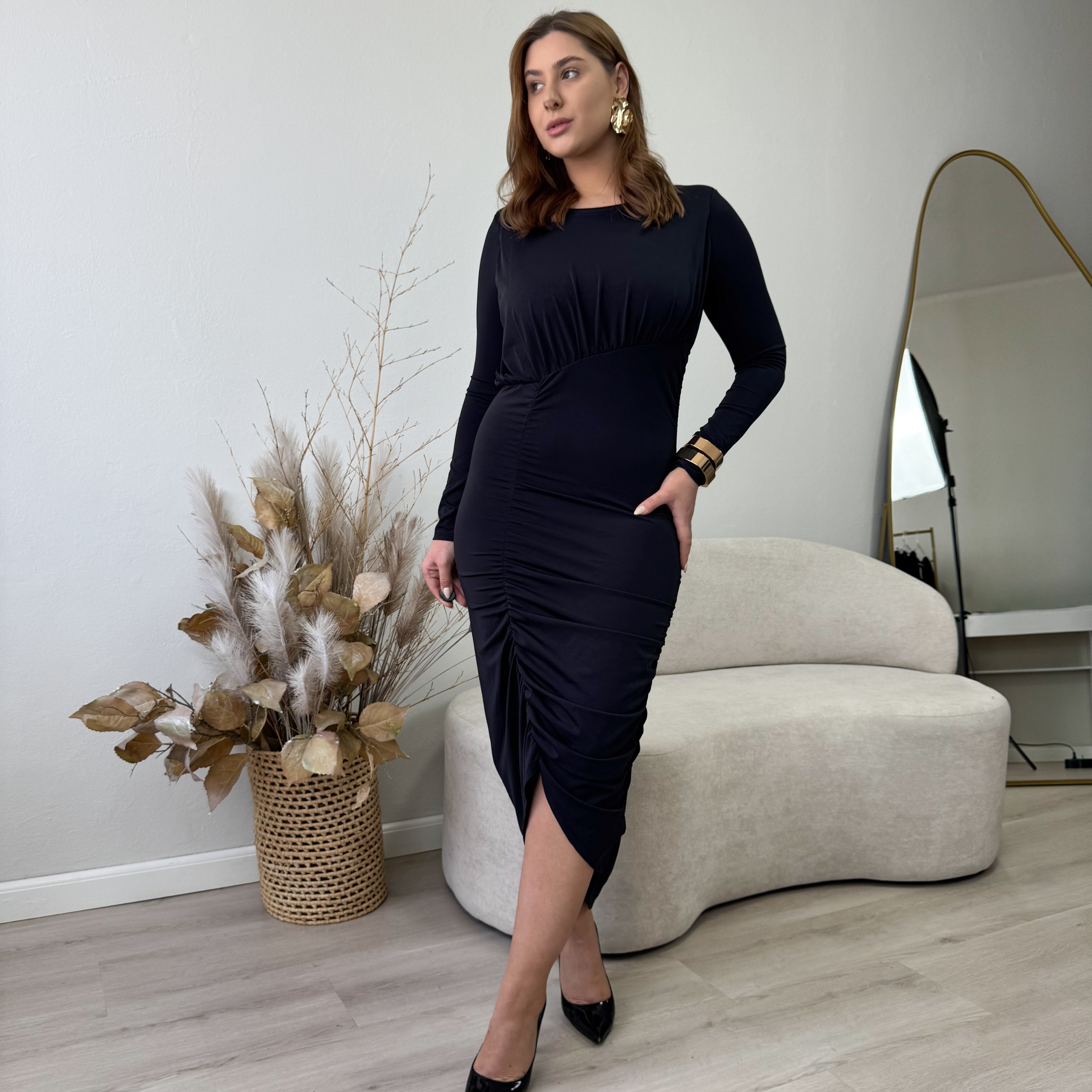 Vestido confeccionado poliamida, modelagem justa ao corpo e comprimento midi. Possui detalhes drapeados laterais e abaixo do busto, mangas longas e ombreiras. Fechamento posterior por zíper invisível.